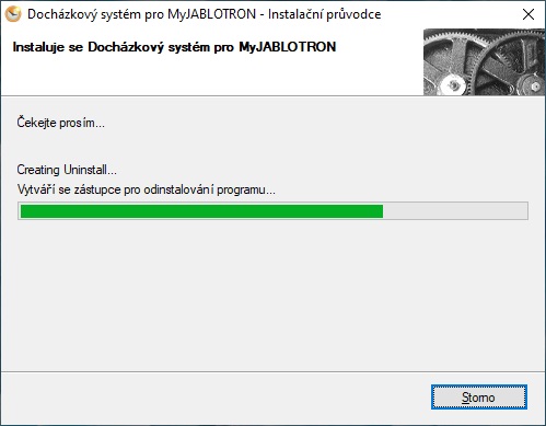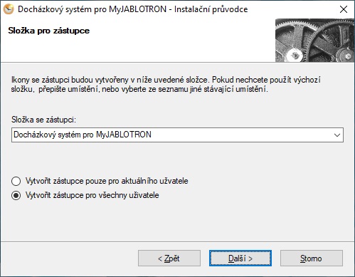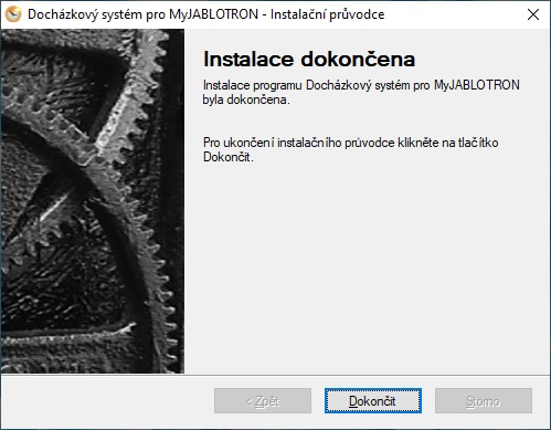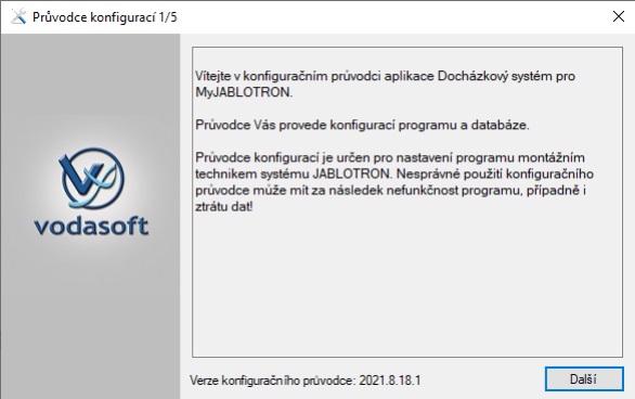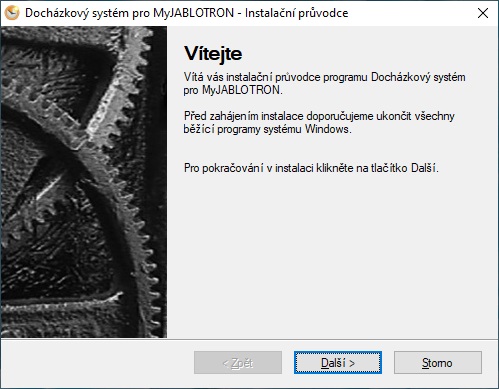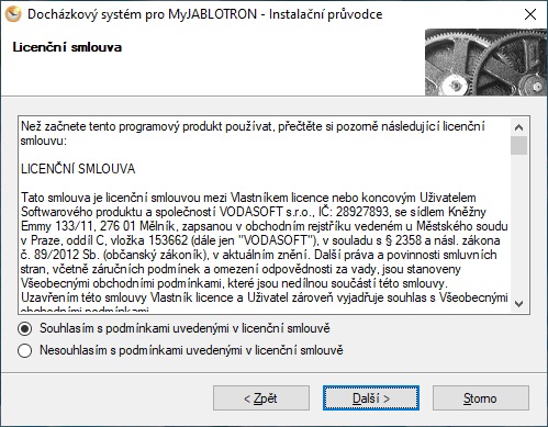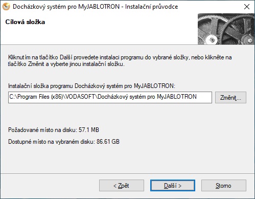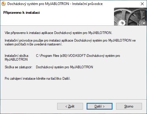 Instalace se spustí spuštěním programu Setup.exe. Instalaci programu je třeba provádět pod uživatelským účtem s administrátorským oprávněním. U počítačů v doméně Windows postačí administrátorská práva k lokálnímu počítači. Během instalace se potvrdí pouze licenční ujednání a zvolí se umístění programu. Po úspěšné instalaci je na Ploše zástupce pro spuštění programu Docházkový systém pro MyJABLOTRON a v nabídce Start je složka VODASOFT se zástupcem pro spuštění docházkového systému a konfiguračního průvodce.