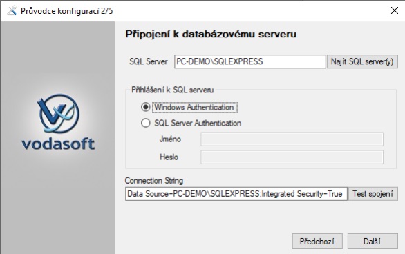 Zde se zadá SQL Server a vyplní se autentizační parametry