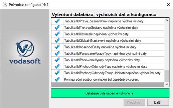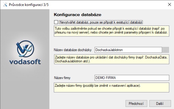V konfiguraci databáze se zadá název databáze, který bude použit pro docházkový systém a název firmy (lze později změnit)